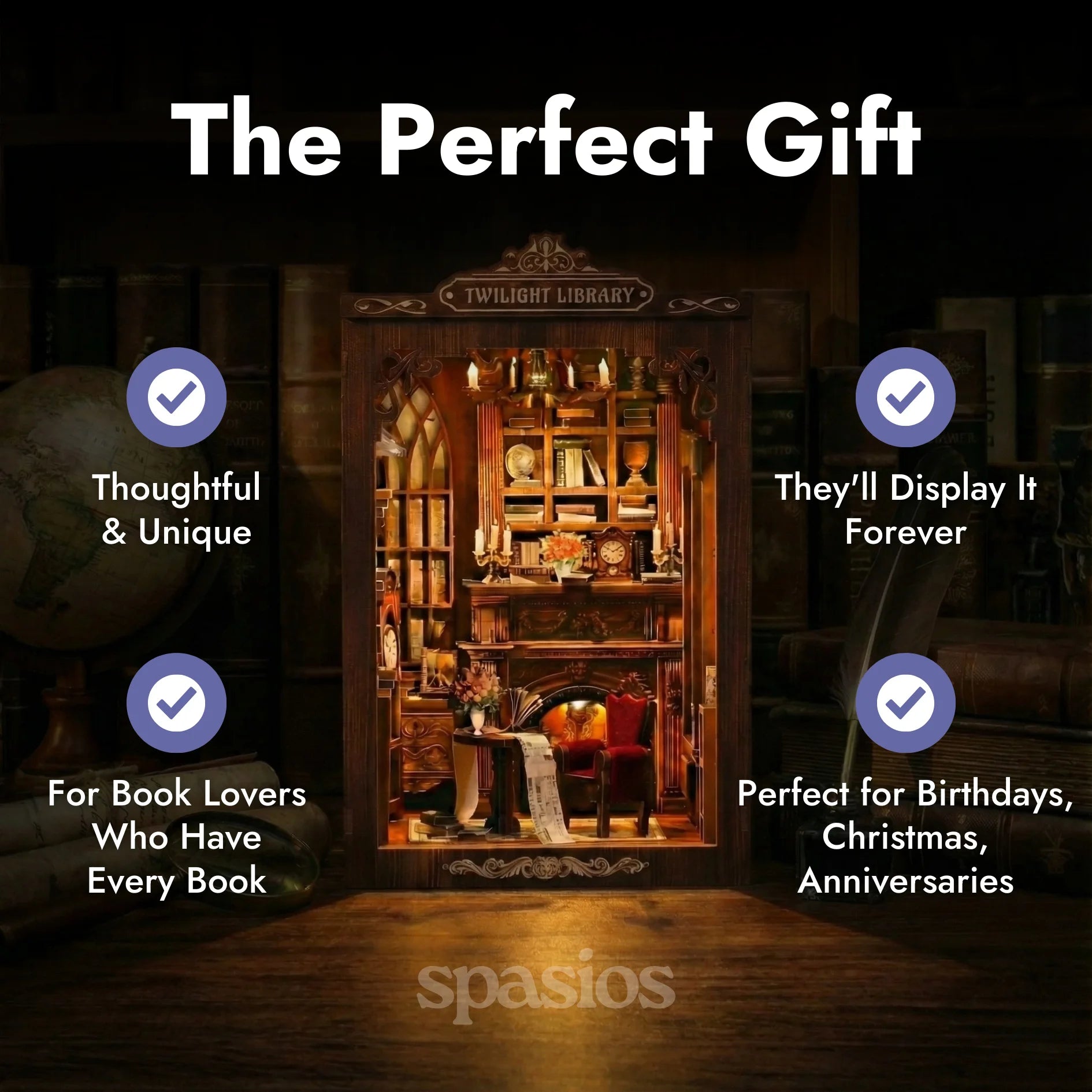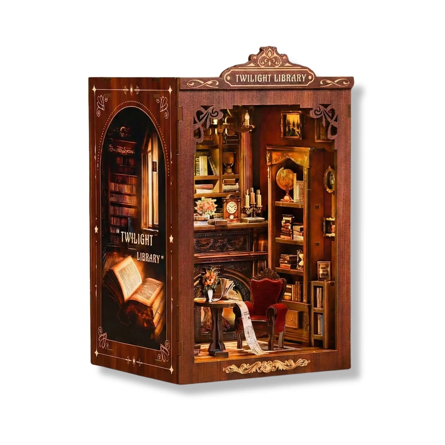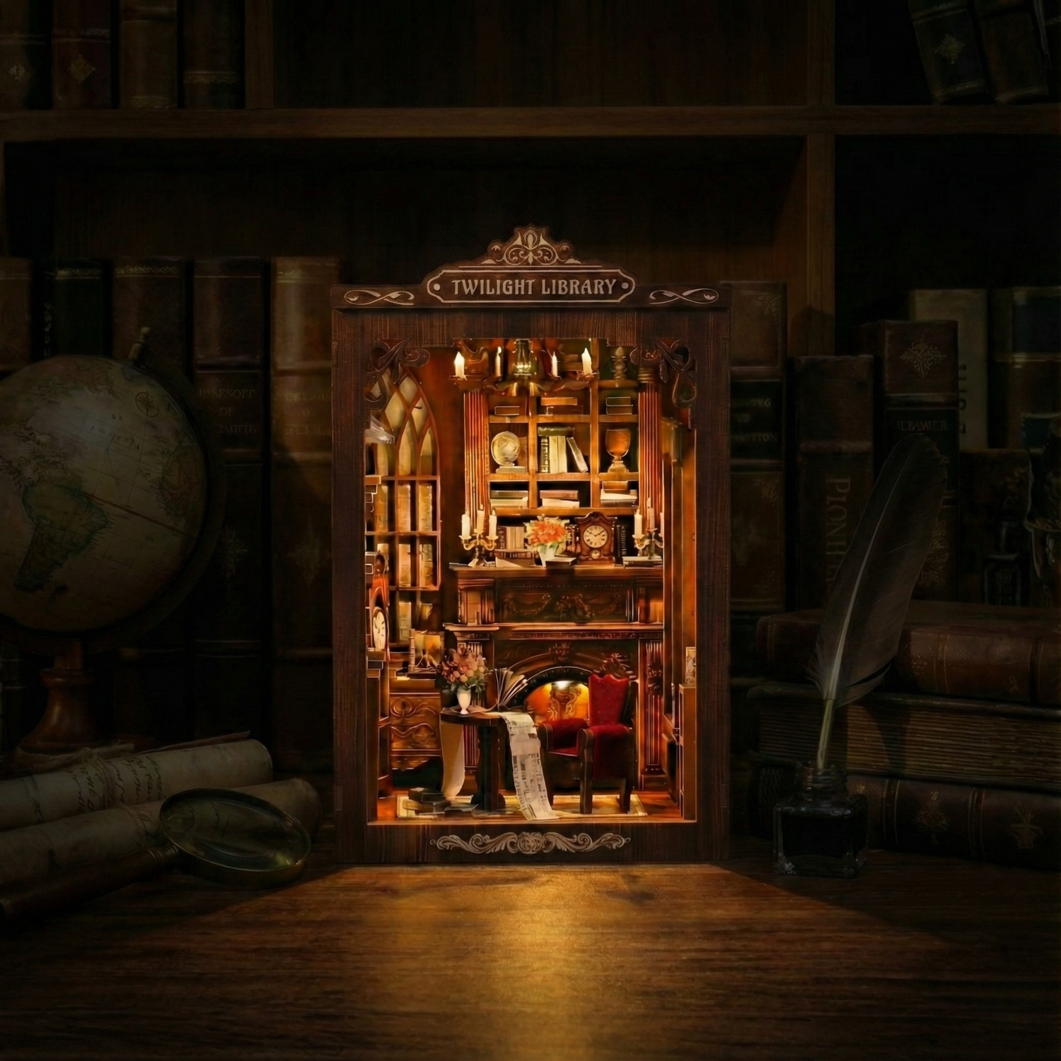 - The "TWILIGHT LIBRARY" sign with decorative scrollwork