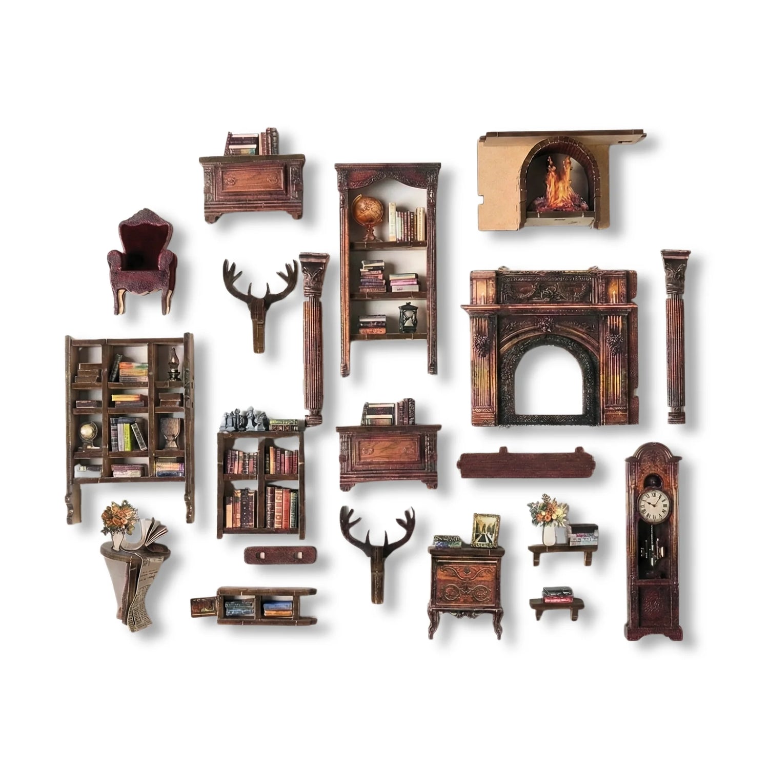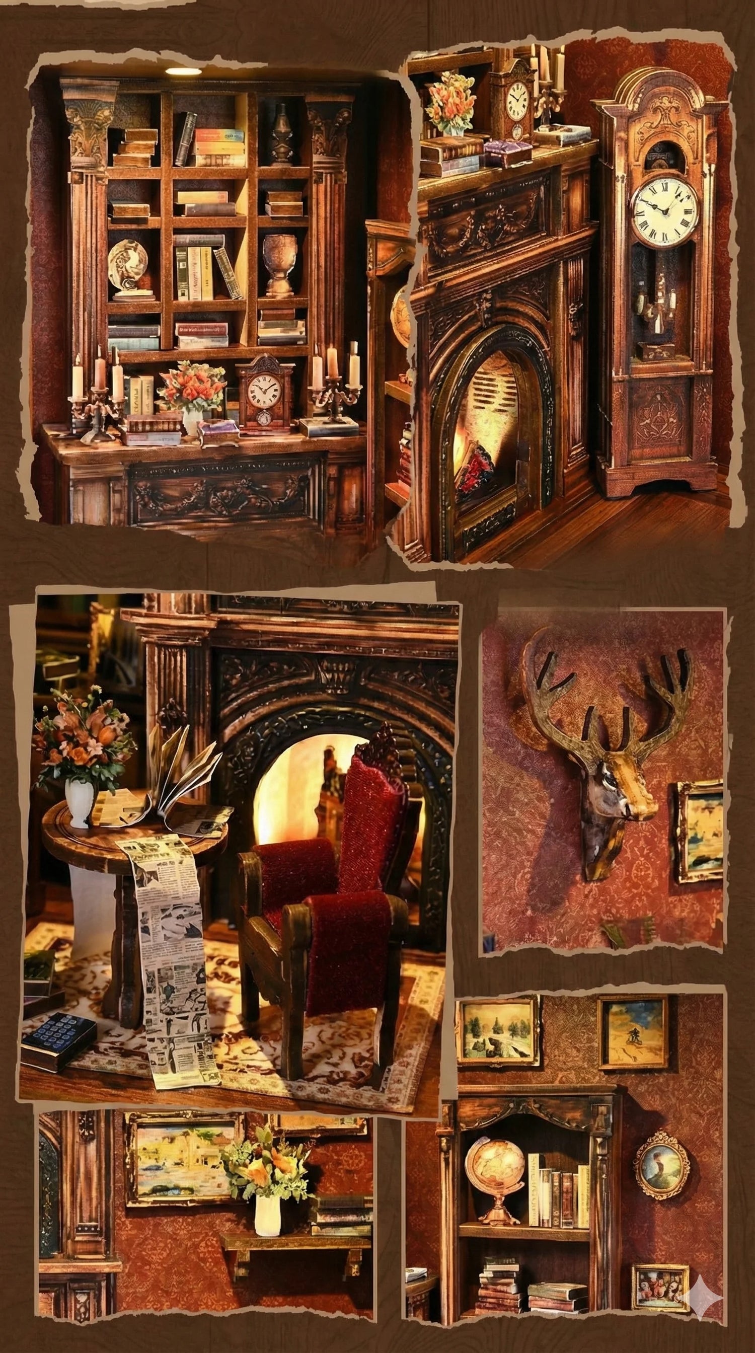 Gothic-style reading room with warm LED lighting, vintage furniture, obsessive tiny details.